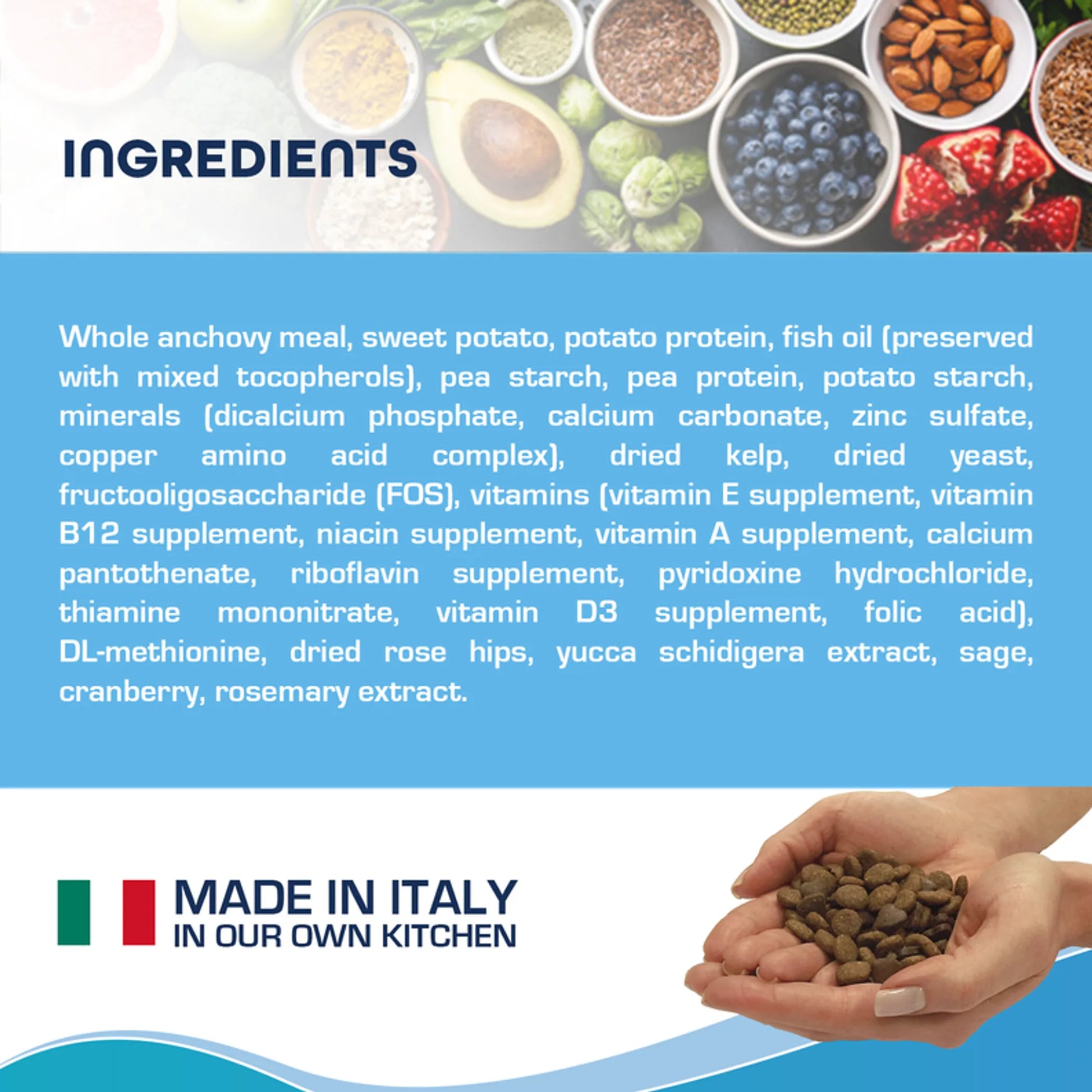 Made with wild-caught anchovy rich in Omega-3s and therapeutic plant and fruit extracts, it promotes overall well-being while being gentle on the digestive system.